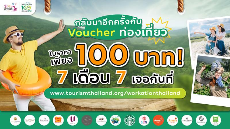 การท่องเที่ยวแห่งประเทศไทย (ททท.) จัดหนักจัดเต็มอีกครั้ง กับกิจกรรมส่งเสริมการขาย “Workation Thailand 100 เดียวเที่ยวได้งาน” ในรอบ 7 เดือน 7 เพื่อส่งเสริมการตลาดและกระตุ้ นให้เกิดการเดินทางท่องเที่ ยวภายในประเทศและพักค้างคืนในวั นธรรมดา โดยนำเสนอสินค้าและการบริการด้ านการท่องเที่ยวในรูปแบบบั ตรกำนัล (Voucher) ซึ่งจะเสนอขายในราคาเพียง 100 บาท เท่านั้น