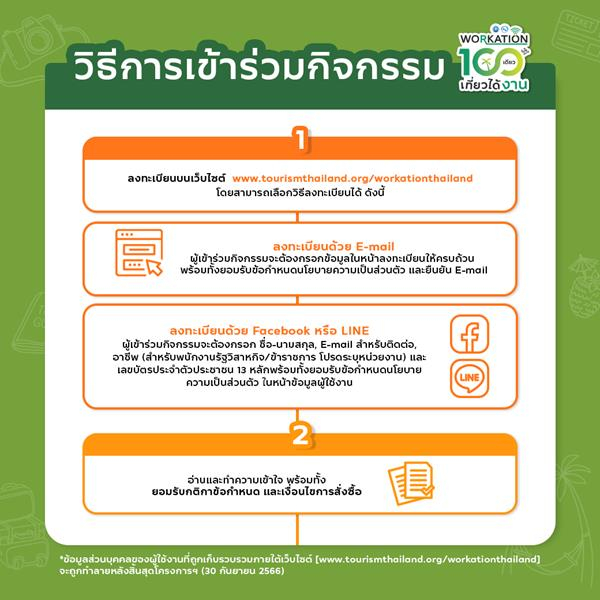 ลงทะเบียนบนเว็บไซต์ www.tourismthailand.org/ workationthailand โดยสามารถเลือกวิธีลงทะเบียนได้ ด้วย E-mail, Facebook หรือ Line