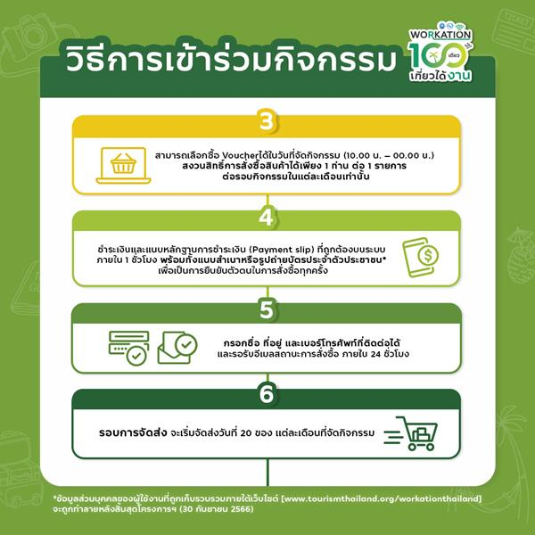 กิจกรรมส่งเสริมการขาย “Workation Thailand 100 เดียวเที่ยวได้งาน” ซึ่งเป็นกิจกรรมที่นำเสนอสินค้ าและบริการด้านการท่องเที่ ยวในราคาเพียง 100 บาท เพื่อส่งเสริมการตลาดและกระตุ้ นให้เกิด การเดินทางท่องเที่ ยวภายในประเทศและพักค้างคืนในวั นธรรมดา ผ่านเว็บไซต์ www.tourismthailand.org/ workationthailand โดยเปิดให้นักท่องเที่ยวเข้าร่ วมกิจกรรมรอบแรกในวันที่ 6 มิถุนายน 2566 ที่ผ่านมา ซึ่งได้รับผลตอบรับเป็นอย่างดี และในรอบต่อไปที่จะเปิดให้นักท่ องเที่ยวเข้าร่วมกิจกรรมได้ในวั นที่ 7 กรกฎาคม 2566 โดยสามารถเลือกซื้อ Voucher ได้ในเวลา 10.00 น. – 00.00 น.