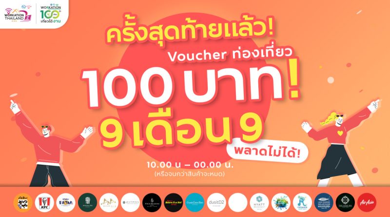 การท่องเที่ยวแห่งประเทศไทย (ททท.) ทุ่มหนัก จัดโปรโมชั่นสุดคุ้มในรอบสุดท้าย เพื่อส่งเสริมการตลาดและกระตุ้นให้เกิดการเดินทางท่องเที่ยวภายในประเทศและพักค้างคืนในวันธรรมดา ผ่านกิจกรรมส่งเสริมการขาย “Workation Thailand 100 เดียวเที่ยวได้งาน” ในรอบ 9 เดือน 9 ซึ่งเป็นกิจกรรมที่นำเสนอสินค้าและการบริการด้านการท่องเที่ยวในรูปแบบบัตรกำนัล (Voucher) โดยจะเสนอขายในราคาเพียง 100 บาท เท่านั้น