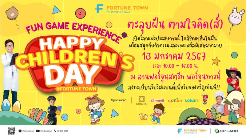 10 มกราคม 2567, กรุงเทพฯ – ฟอร์จูนทาวน์ (Fortune Town) ศูนย์รวมไอทีและไลฟ์สไตล์ชั้นนำย่าน รัชดา-พระราม 9 ร่วมกับโรงแรมแกรนด์ ฟอร์จูน กรุงเทพฯ และพันธมิตร ส่งมอบความสุขต้อนรับวันเด็กแห่งชาติ ปี 2567 พร้อมเปิดโลกแห่งประสบการณ์ ตะลุยฝัน ตามใจคิด(ส์) เกินจินตนาการ ใกล้ชิดกับอาชีพในฝันกับกิจกรรม “Happy Children’s Day @ Fortune Town” บริเวณ ลานฟอร์จูนสตรีท ฟอร์จูนทาวน์ รัชดา-พระราม พร้อมเสิร์ฟโปรโมชั่นเด็กทานฟรีมื้อเที่ยงที่ ห้องอาหารนานาชาติ วัน รัชดา โรงแรมแกรนด์ ฟอร์จูน กรุงเทพฯ ในวันที่ 13 มกราคม 2567 วันเดียวเท่านั้น