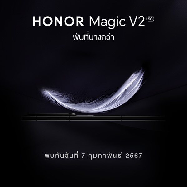 ห้ามพลาด! เตรียมสัมผัสกับความมหัศจรรย์แห่งความบางและเบาที่สุด ครั้งแรกในประเทศไทย ในงานแถลงข่าวเปิดตัวสมาร์ตโฟนจอพับรุ่นใหม่ HONOR Magic V2 และโปรโมชันสุดพิเศษ พร้อมกันในวันพุธที่ 7 กุมภาพันธ์ 2567 เวลา 14.00 น. ผ่านทาง Facebook และ YouTube Live HONOR Thailand โดยจะเริ่มพรีออเดอร์พร้อมโปรโมชันพิเศษระหว่างวันที่ 8 – 12 กุมภาพันธ์ และเริ่มวางจำหน่ายสินค้าที่ร้านตัวแทนจำหน่ายทั่วประเทศในวันที่ 13 กุมภาพันธ์ 2567