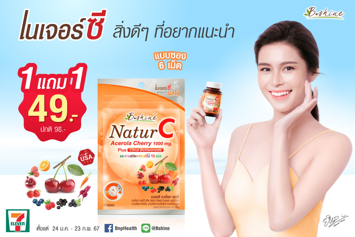 บริษัท บีไชน์ นูทริชั่น พลัส จำกัด ผู้จัดจำหน่าย “บีไชน์ เนเจอร์ซี” วิตามินซีธรรมชาติ 100% ได้จัดโปรโมชั่นลดสุดคุ้ม “บีไชน์ เนเจอร์ซี” แบบซองพกพาสะดวก ขนาดบรรจุ 5 เม็ด แถมฟรี 1 เม็ด (แถมในซอง) ซื้อ 1 แถม 1 เพียง 49 บาท จากปกติ ราคา 98 บาท และสมาชิก All member รับคะแนนเพิ่มอีก 100 คะแนน สามารถซื้อได้ตั้งแต่วันนี้ – 23 กุมภาพันธ์ 2567 ที่ร้านเซเว่น อีเลฟเว่น ทั่วประเทศ
