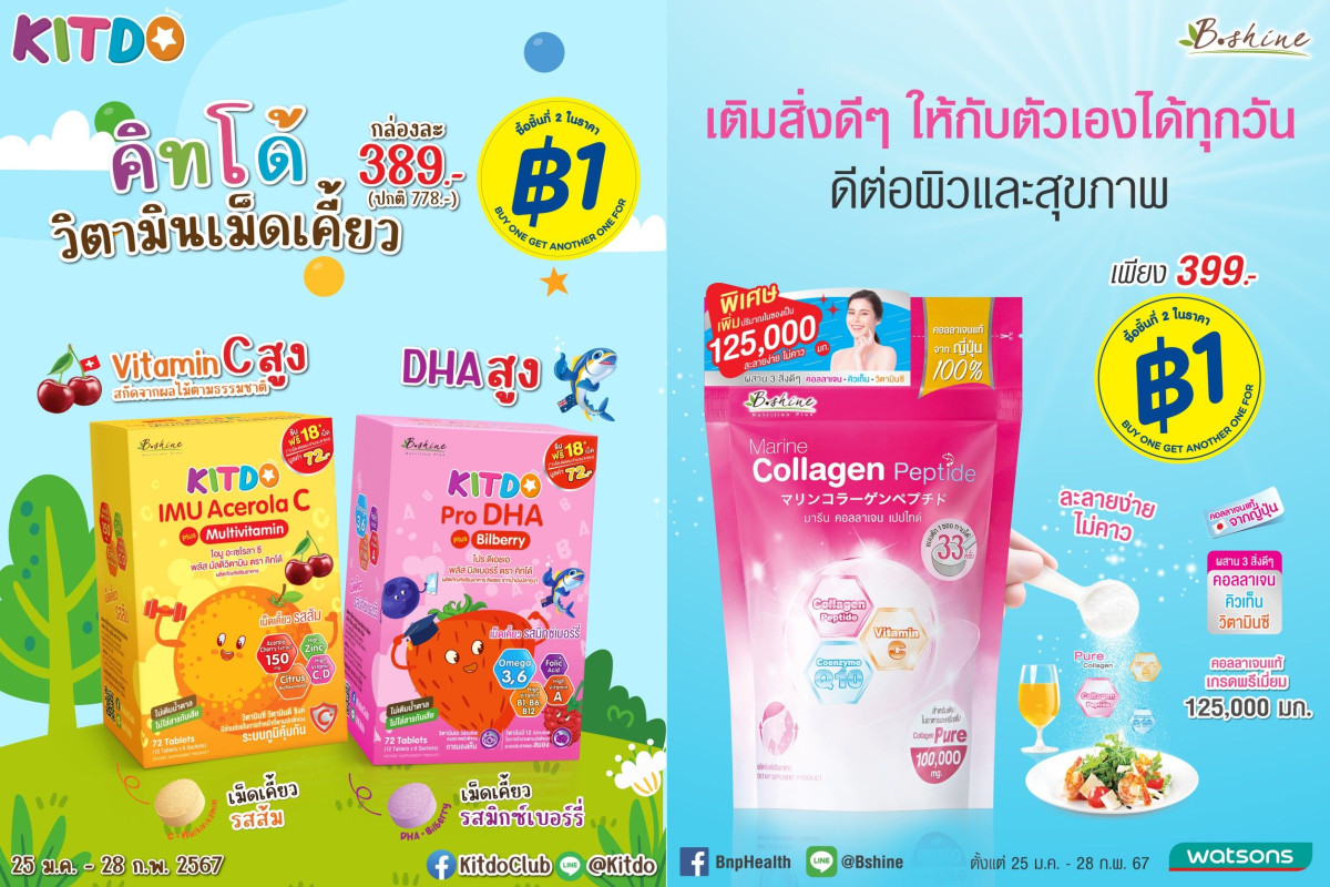 บริษัท บีไชน์ นูทริชั่น พลัส จำกัด ร่วมกับ “วัตสัน” ส่ง 2 ผลิตภัณฑ์เพื่อสุขภาพ “บีไชน์ มารีน คอลลาเจน เปปไทด์” คอลลาเจนแท้เกรดพรีเมี่ยมจากญี่ปุ่นแท้ 100% และ “คิทโด้” วิตามินเม็ดเคี้ยว มี 2 สูตร 2 รสชาติ หอมอร่อย อัดแน่นไปด้วยคุณภาพพร้อมประโยชน์เน้นๆ จัดโปรโมชั่นชิ้นแรกราคาพิเศษ และซื้อชิ้นที่ 2 เพียง 1 บาท ในราคาสุดคุ้มมาก ตั้งแต่วันนี้ – 28 กุมภาพันธ์ 2567 สามารถซื้อได้ที่ร้านวัตสัน ทุกสาขา