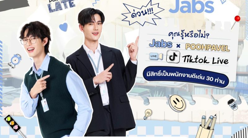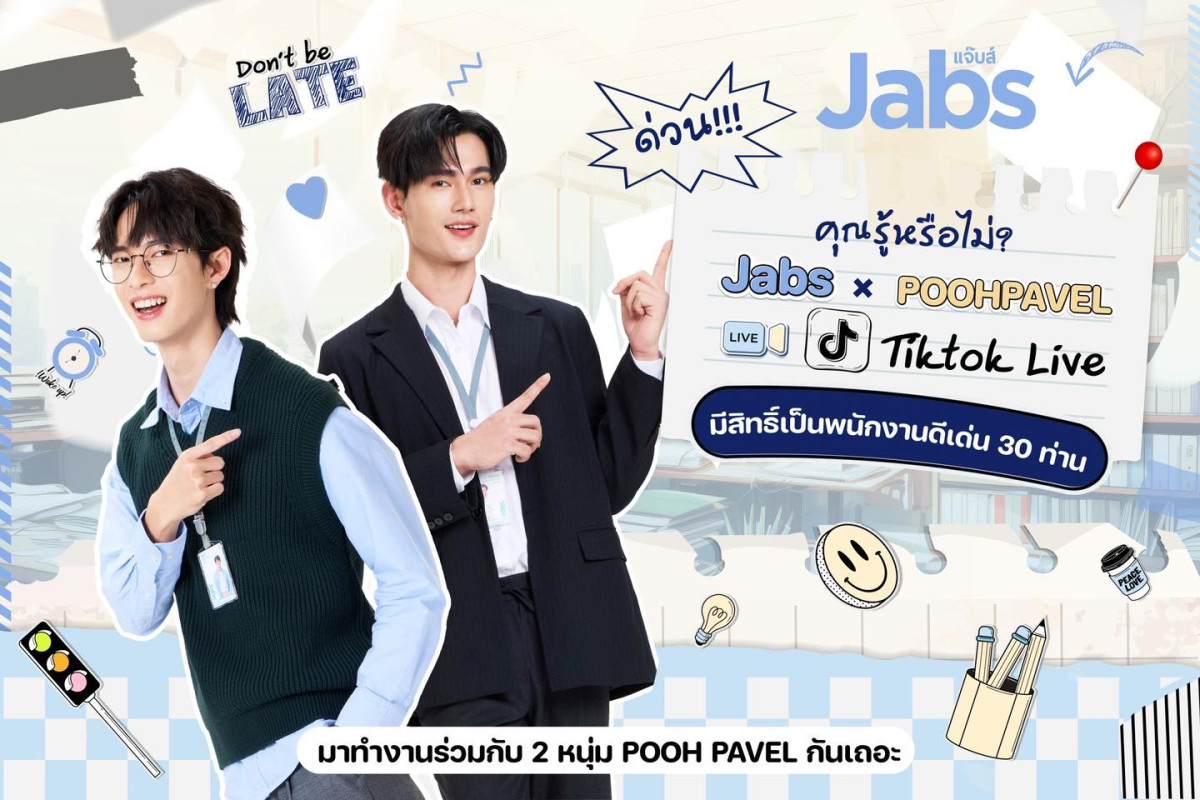 แจ๊บส์ ชวนหนุ่มสาวชาวออฟฟิศมาเป็นพนักงานดีเด่น บริษัท Jabs ร่วมกิจกรรมชมไลฟ์สด และ Mini Meet & Greet ในงาน “Hurry Jabs! So late, So love รักนี้ห้ามมาสาย” สำหรับใครที่อยากพบกับ 2 หนุ่มสุดฮอต พาเวล-นเรศ พร้อมเผ่าพันธุ์ ฝ่ายการตลาดสุดหล่อ และ พูห์-กฤติน กิจจารุวรรณกุล ฝ่าย IT สุดน่ารักแบบเอ๊กคลูซีฟ ขอแค่ตั้งใจทำงาน ไม่เคยมาสาย คุณอาจโชคดีเป็น 1 ใน 30 พนักงานดีเด่นได้ร่วมงานกับบริษัท Jabs อย่างแน่นอน