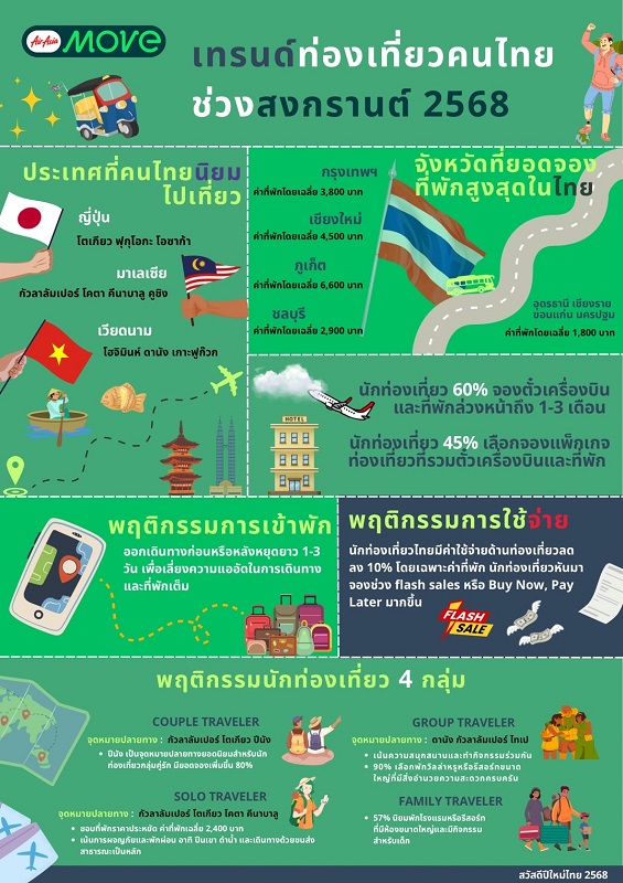 AirAsia MOVE เผย ไทย ยังคงเป็นสถานที่ยอดฮิตที่คนไทยเดินทางช่วงสงกรานต์ พร้อมเผยพฤติกรรมนักท่องเที่ยวแบบ Solo Traveler แบบกลุ่ม และแบบครอบครัว