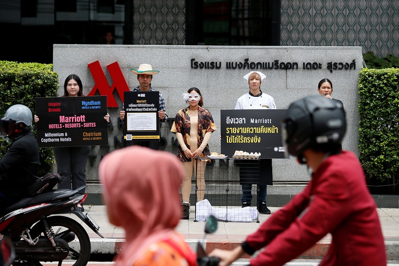 กรุงเทพฯ: 29 กันยายน 2568 – นักรณรงค์จากซิเนอร์เจีย แอนนิมอล (Sinergia Animal) ตั้งแต่กรุงเทพฯ จนถึงรีโอเดจาเนโร จัดกิจกรรมร่วมกันทั่วโลกเรียกร้องและผลักดันให้เครือโรงแรมแมริออทเร่งดำเนินงานตามคำมั่นสัญญาในการใช้ไข่ไก่ปลอดกรง (Cage-Free) 100% ภายในปี 2568 ซึ่งเป็นส่วนหนึ่งของนโยบายด้านความยั่งยืนที่ประกาศไว้ตั้งแต่ปี 2561 แม้ความก้าวหน้าในระดับโลกเป็นที่น่าชื่นชม แต่ยังต้องมุ่งเน้นการดำเนินงานอย่างเต็มที่ในภูมิภาคเอเชียซึ่งเหลือเวลาเพียง 3 เดือนสุดท้าย