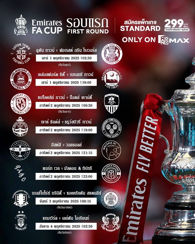 รายการ The Emirates FA Cup ถือเป็นการแข่งขันฟุตบอลที่เก่าแก่ที่สุดในโลก การแข่งขันนี้มีเสน่ห์เฉพาะตัวที่แฟนบอลทั่วโลกรู้จักในฐานะ “มนต์เสน่ห์ของฟุตบอลถ้วย” ซึ่งเปิดโอกาสให้ทีมเล็กได้สร้างประวัติศาสตร์ล้มทีมใหญ่แบบ “ยักษ์ล้ม” ได้เสมอ สำหรับรอบแรกนี้ Monomax พร้อมถ่ายทอดสดให้ชมทั้ง 8 คู่ เด็ด ระหว่างวันที่ 1–4 พฤศจิกายน 2568 ดังนี้