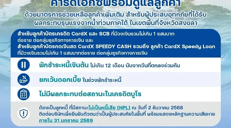 โดยลูกค้าสามารถติดต่อขอเข้าร่วมมาตรการ เพื่อยืนยันตัวตนว่าเป็นผู้ประสบภัยในพื้นที่ พร้อมแสดงหลักฐานความเสียหาย ภายใน 31 มกราคม 2569 ได้ที่ ศูนย์บริการลูกค้าคาร์ดเอกซ์ โทร.1468 หรือ SCB Customer Center โทร 02-777-7777