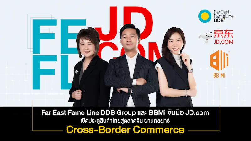 ตลาดจีน 700 ล้านผู้บริโภค กำลังเปิดโอกาสใหม่ให้สินค้าไทย Far East Fame Line DDB Group และ BBMi ประกาศความร่วมมือกับ JD.com เพื่อผลักดันสินค้าไทยเข้าสู่ตลาดจีน ผ่านโมเดล Cross-Border E-Commerce ช่วยให้แบรนด์ไทยเข้าถึงผู้บริโภคจีน โดยไม่ต้องตั้งบริษัทในจีนตั้งแต่วันแรก อีกก้าวสำคัญของการพาแบรนด์ไทยสู่เวที Asia E-Commerce